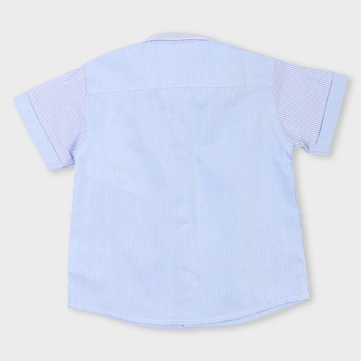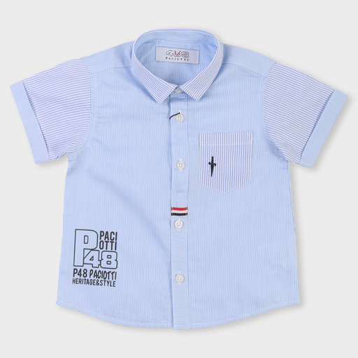 CAMICIA BIMBO MANICA CORTA, FANTASIA A RIGHE BIANCHE E AZZURRO, LOGO SU TASCHINO E SUL LATO.