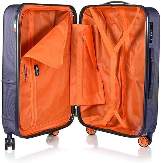 TROLLEY PICCOLO AERONAUTICA MILITARE, DIMENSIONI 55 x 38 x 20 Cm. Trolley Bagaglio a mano 55 cm in ABS, spinner da cabina quattro ruote in rivestimento rigido, con lucchetto a combinazione numerica senza chiavi, completo di serratura TSA. Con chiusura con zip, maniglia singola, asta bitubo telescopica, e comparto foderato con tasca zippata centrale, fermabiti, e comparto chiuso da zip, completo di tasca a rete chiusa da cerniera.