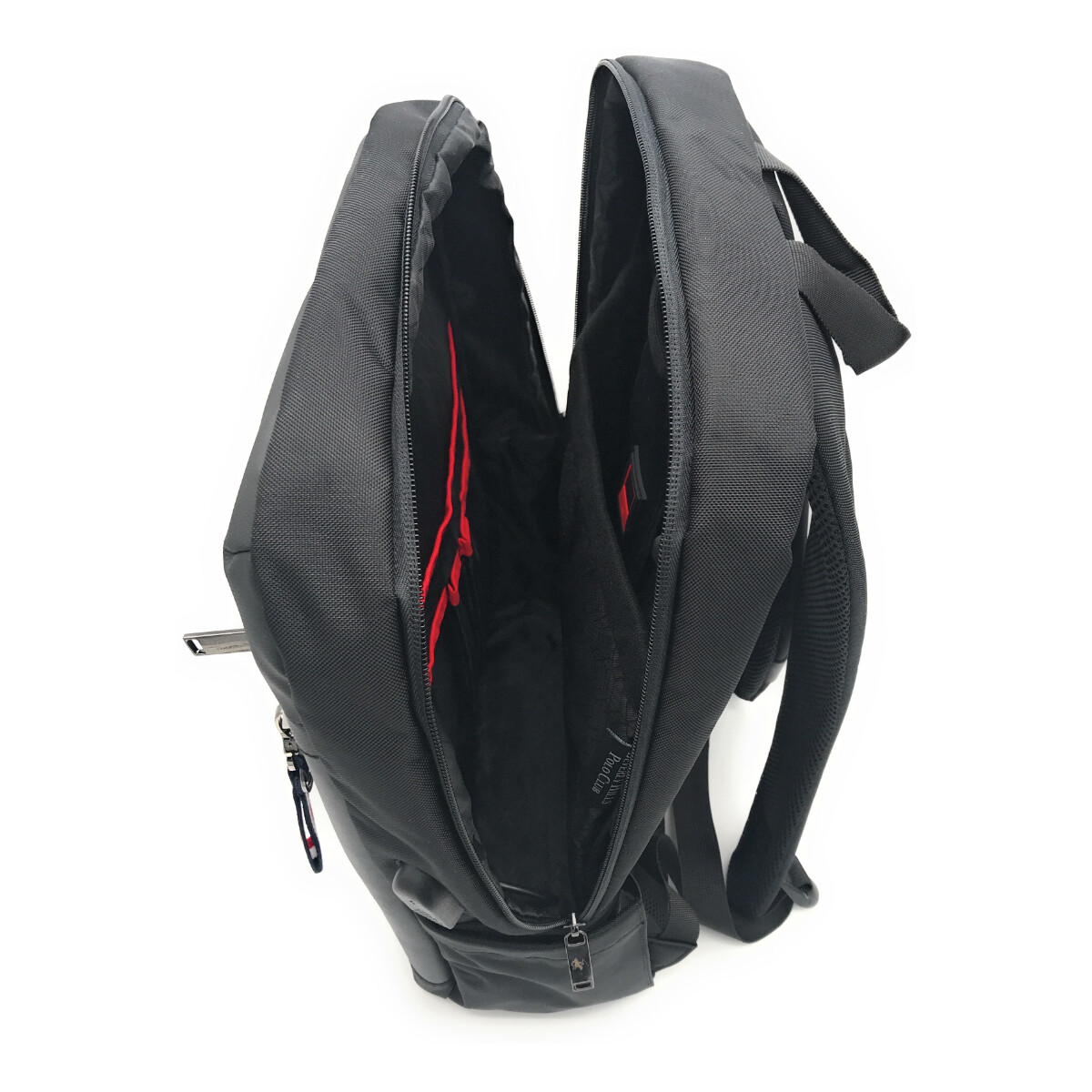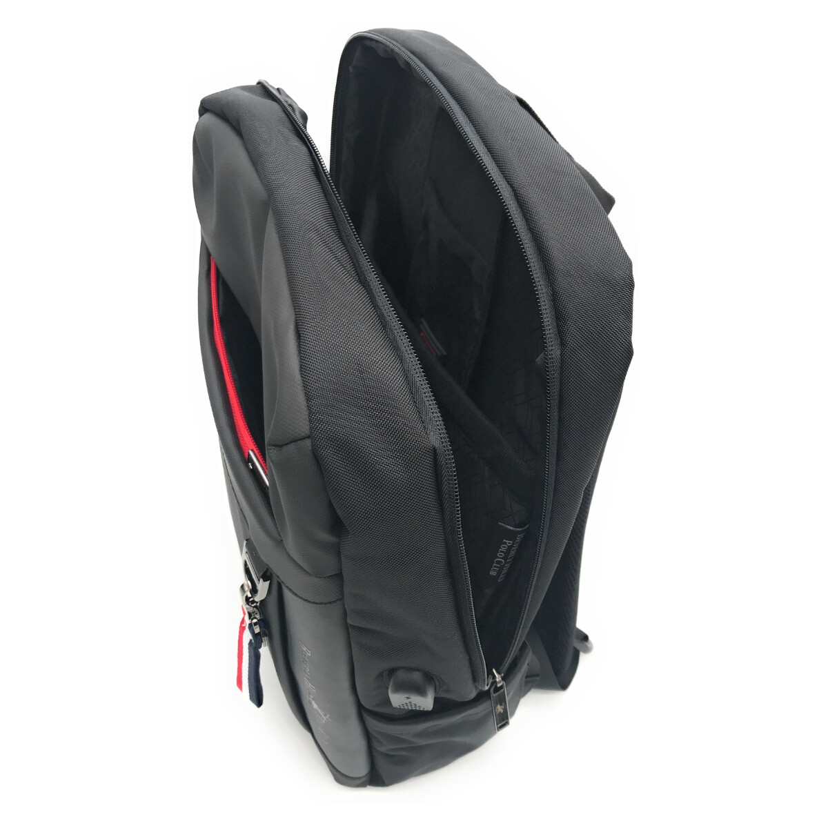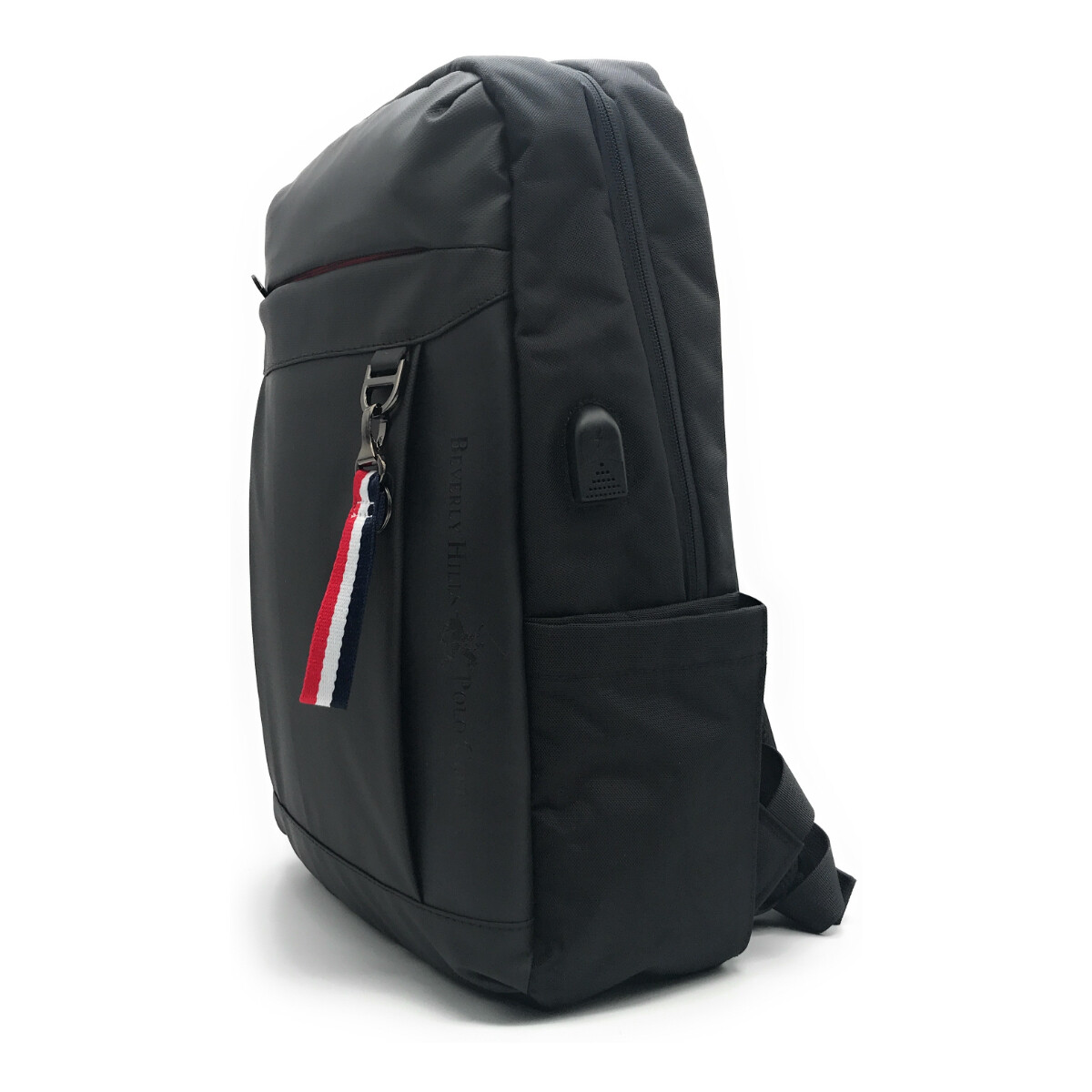 ZAINO BEVERLY HILLS POLO CLUB, MODELLO PORTLAND, PROFONDA TASCA FRONTALE E DUE TASCHE LATERALI, SCOMPARTO PORTA PC, PORTA DI RICARICA USB, SISTEMA DI AGGANCIO AL TROLLEY, TESSUTO TECNICO.