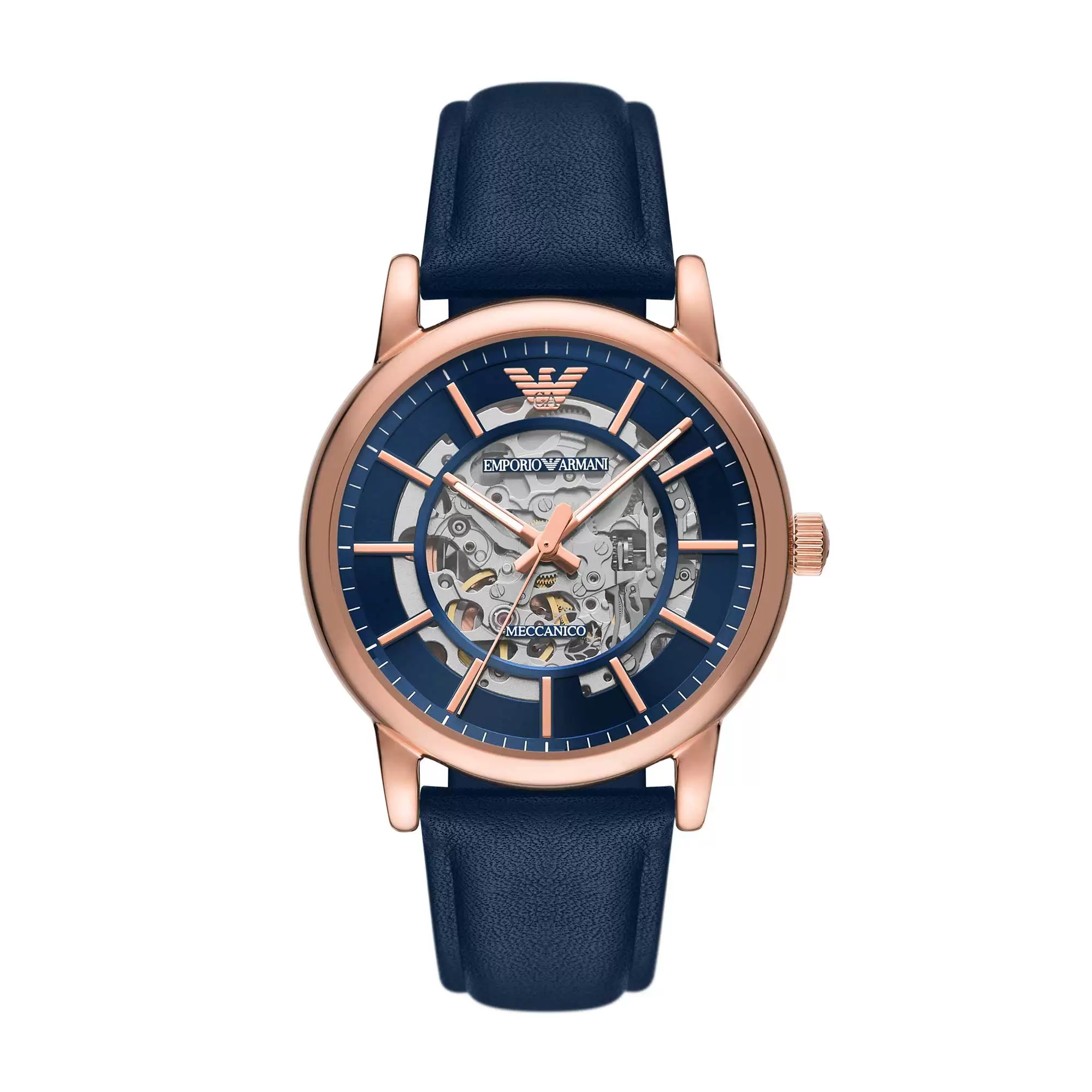 Colore quadrante: trasparente con calibro a vista e dettagli color blu ed oro rosa