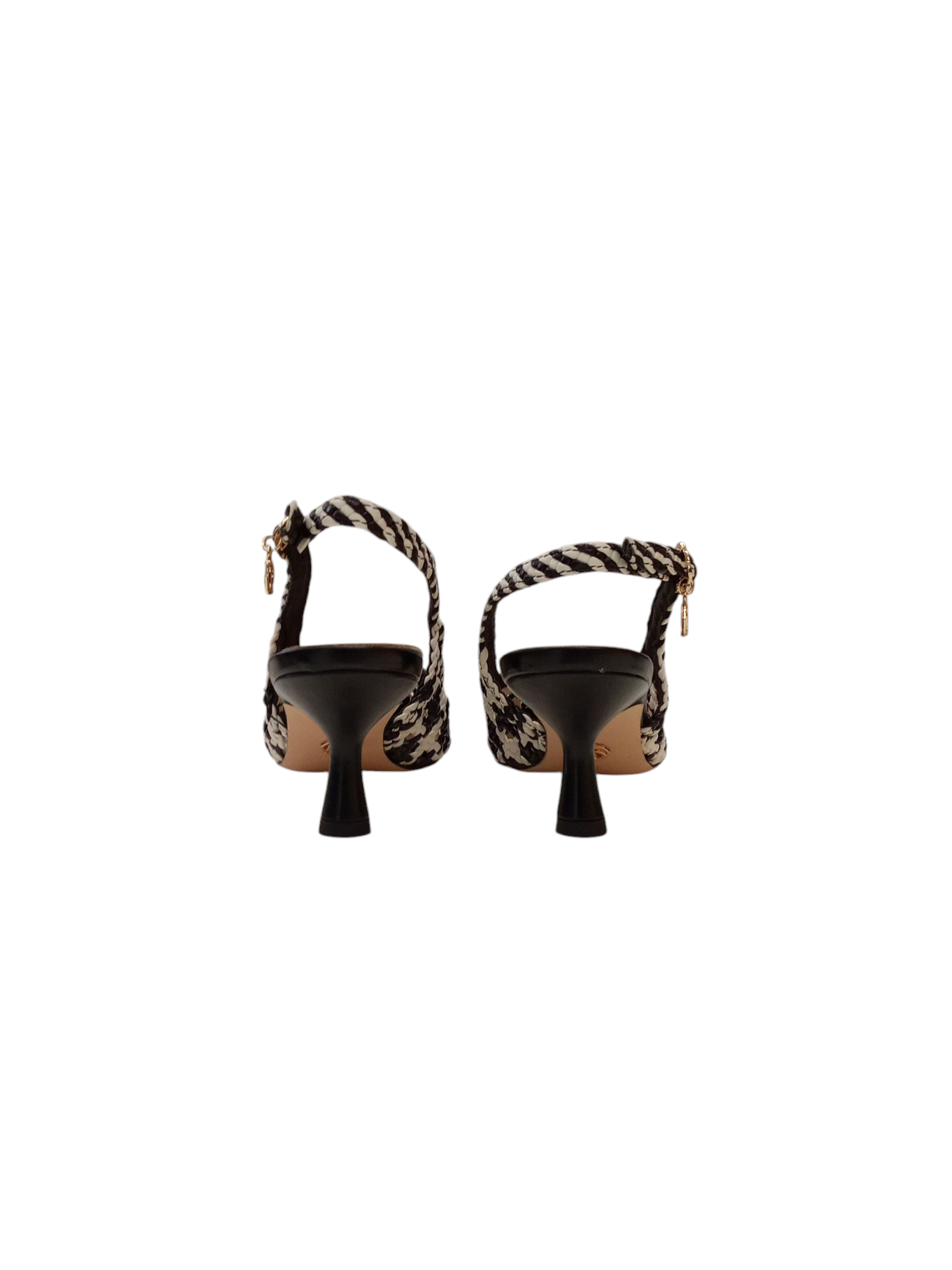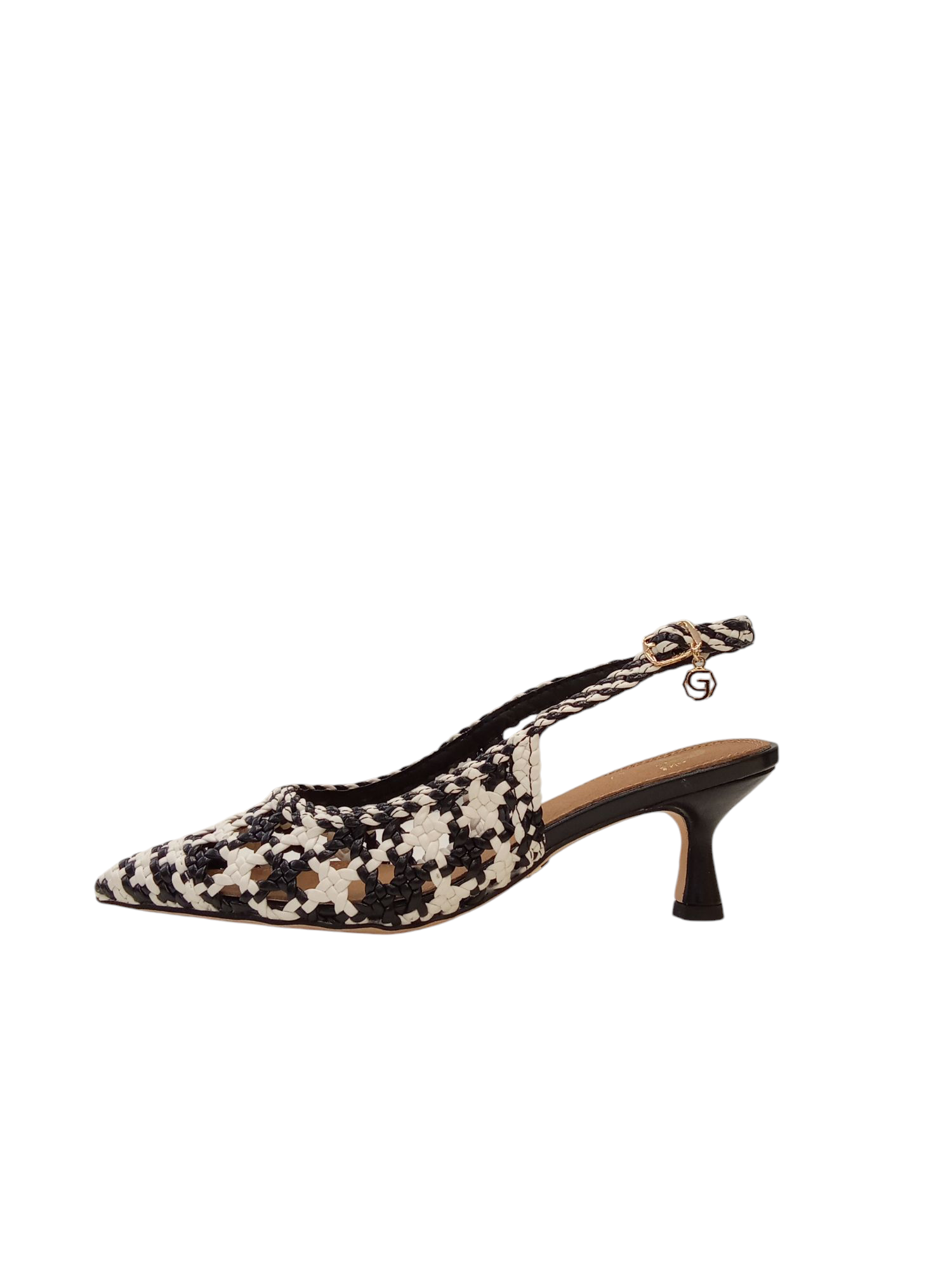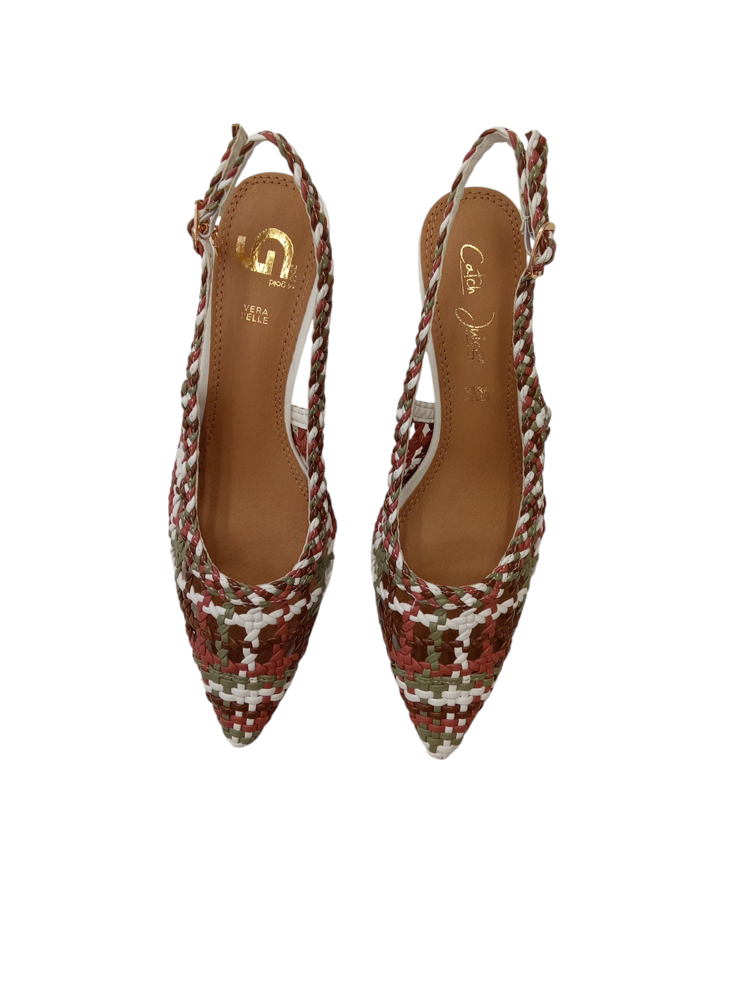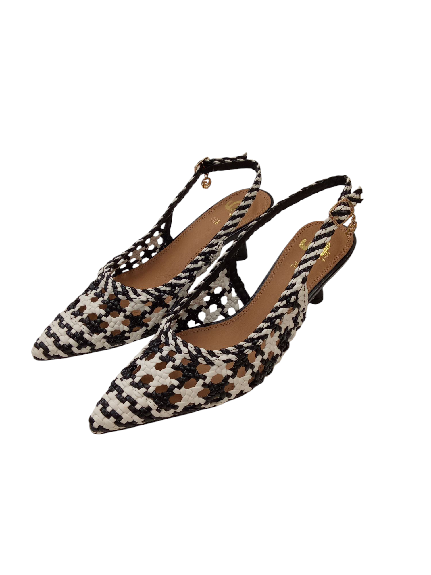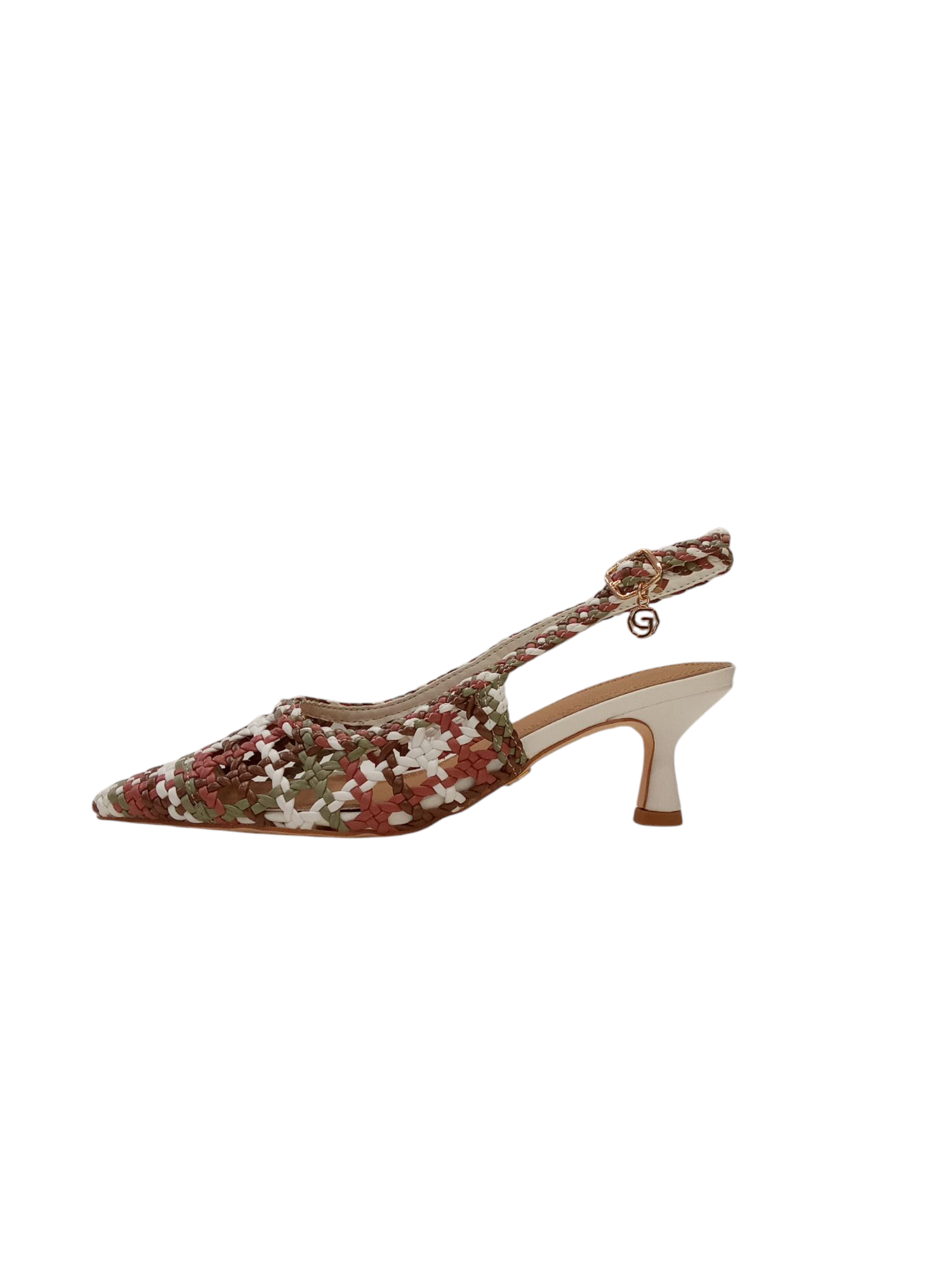 DECOLLETE' GOLD & GOLD, A PUNTA CON TACCO MEDIO, CHIUSURA REGOLABILE ALLA CAVIGLIA, INTRECCIO MULTICOLOR.