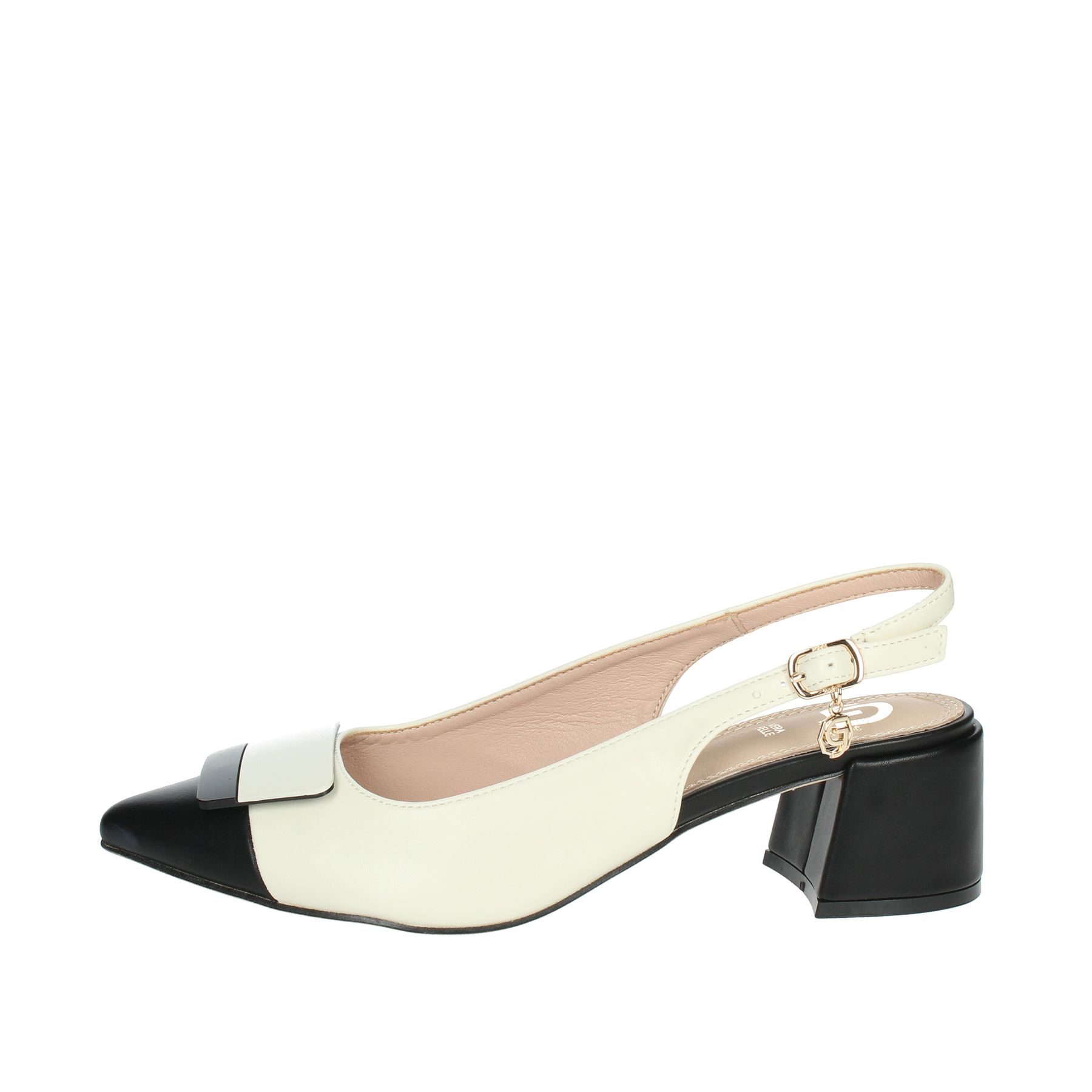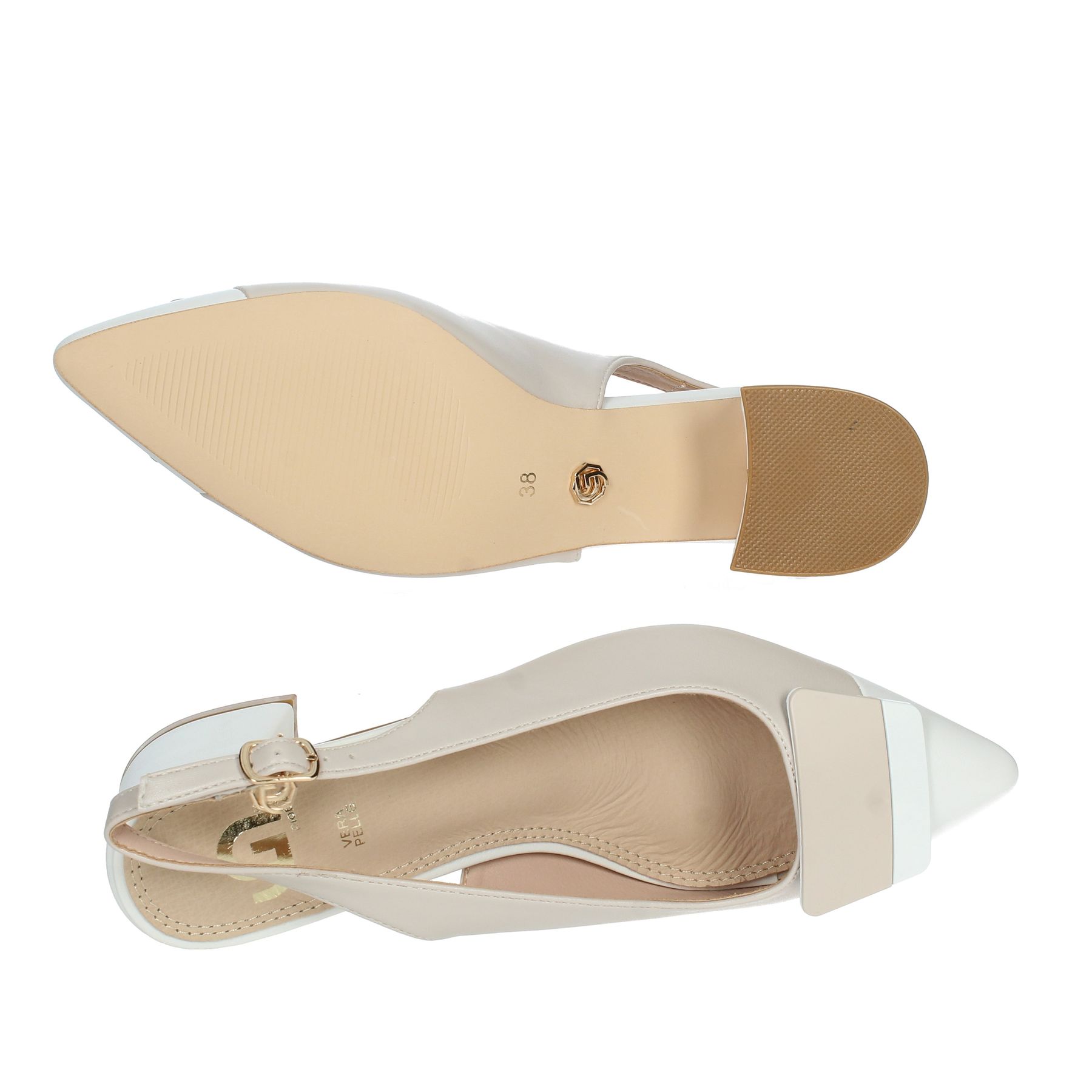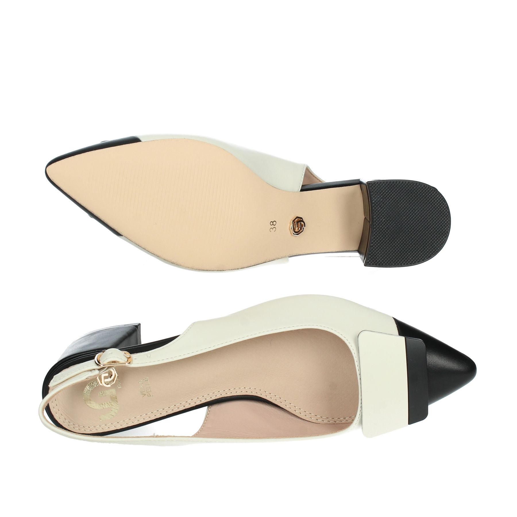 CHANEL GOLD & GOLD, TACCO QUADRATO, DETTAGLIO SULLA PUNTA BICOLORE, CINTURINO REGOLABILE, LOGO PENDENTE AL CINTURINO, SOTTOPIEDE IN PELLE
