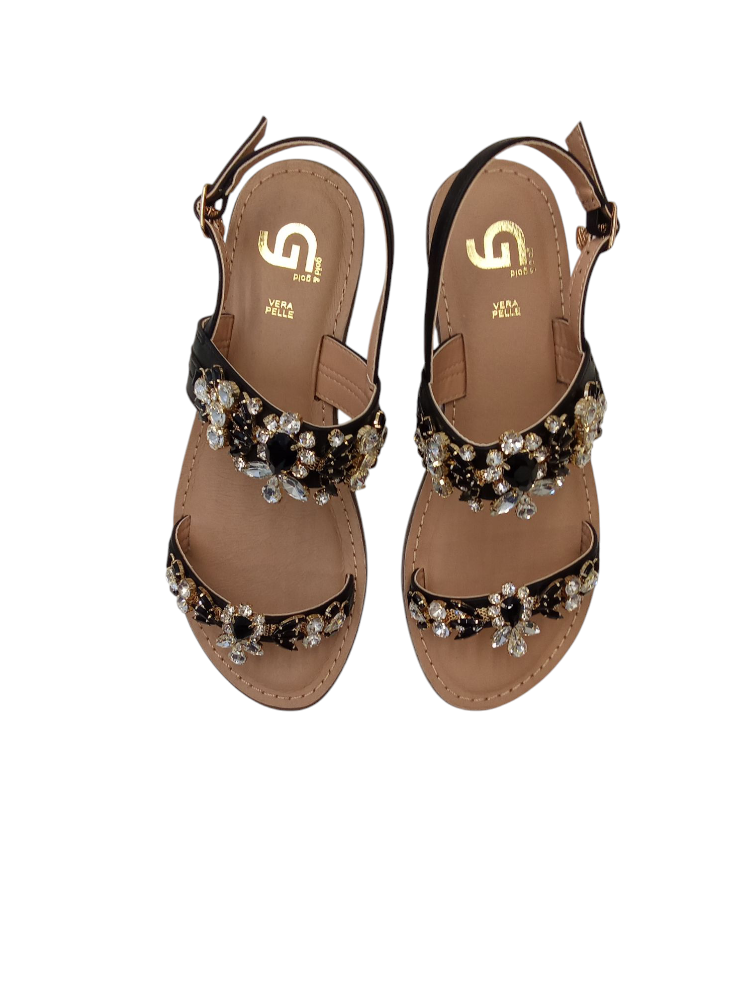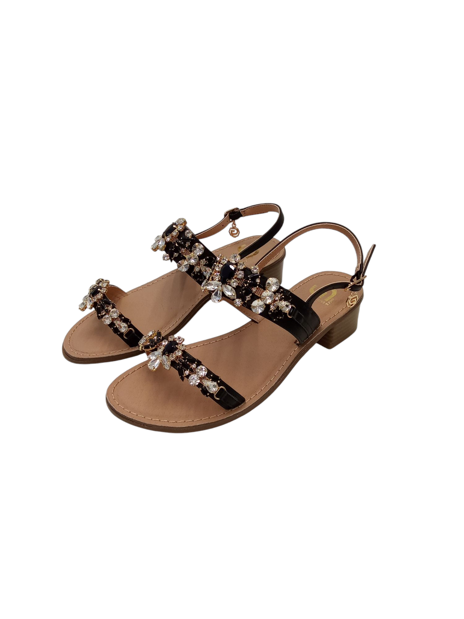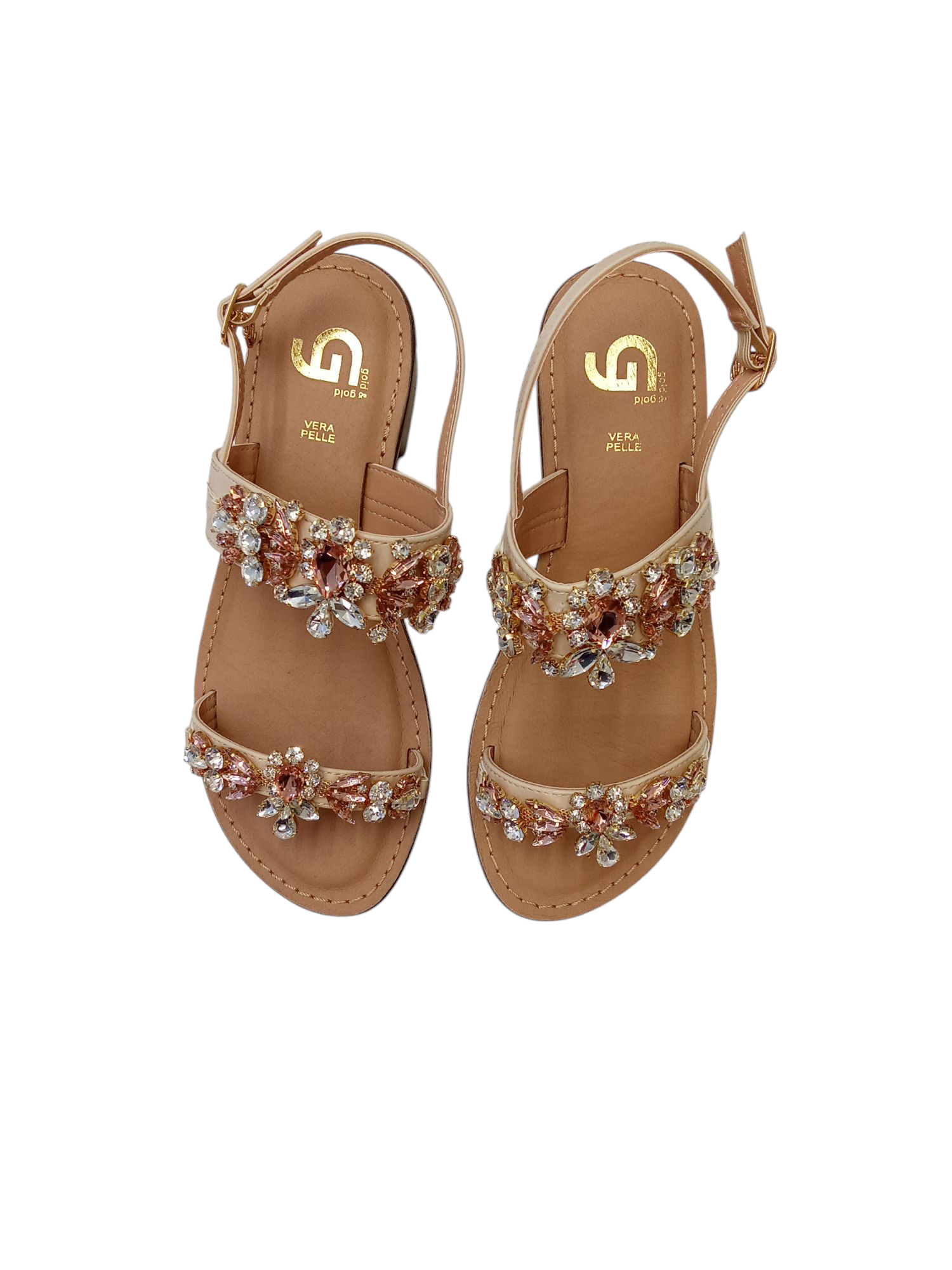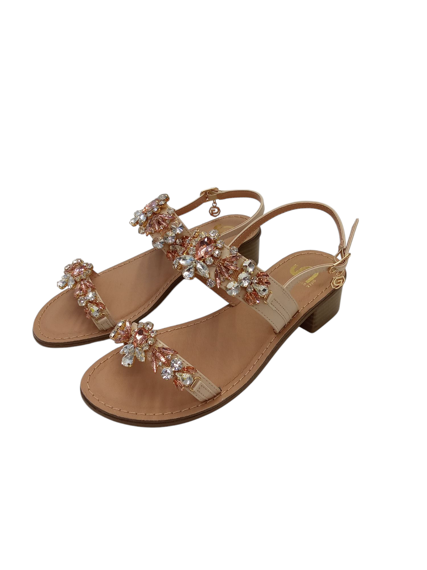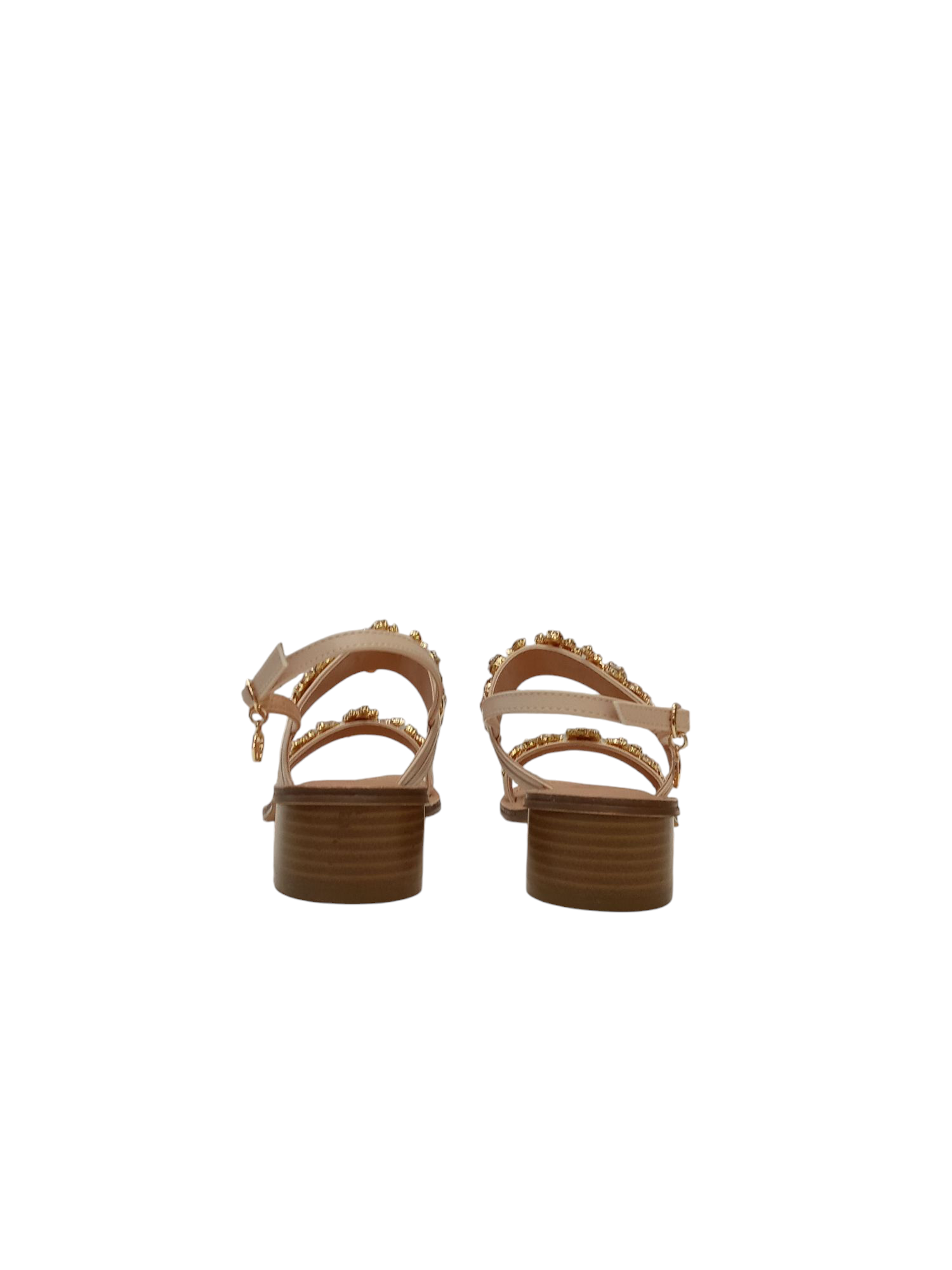 SANDALO GOLD & GOLD, CON TACCO IN ECOPELLE, DECORATO DA PIETRE E CINTURINO REGOLABILE SULLA CAVIGLIA.