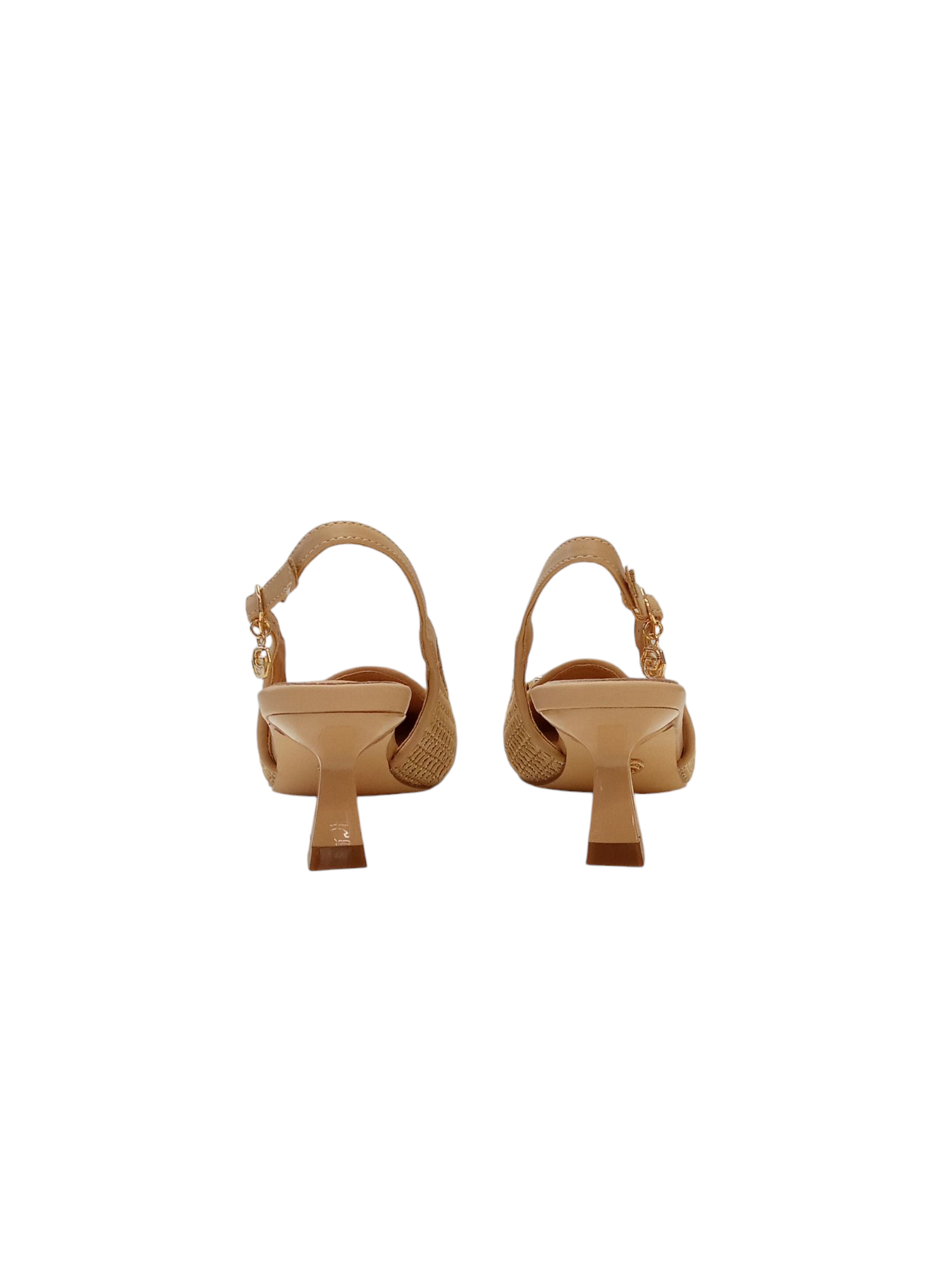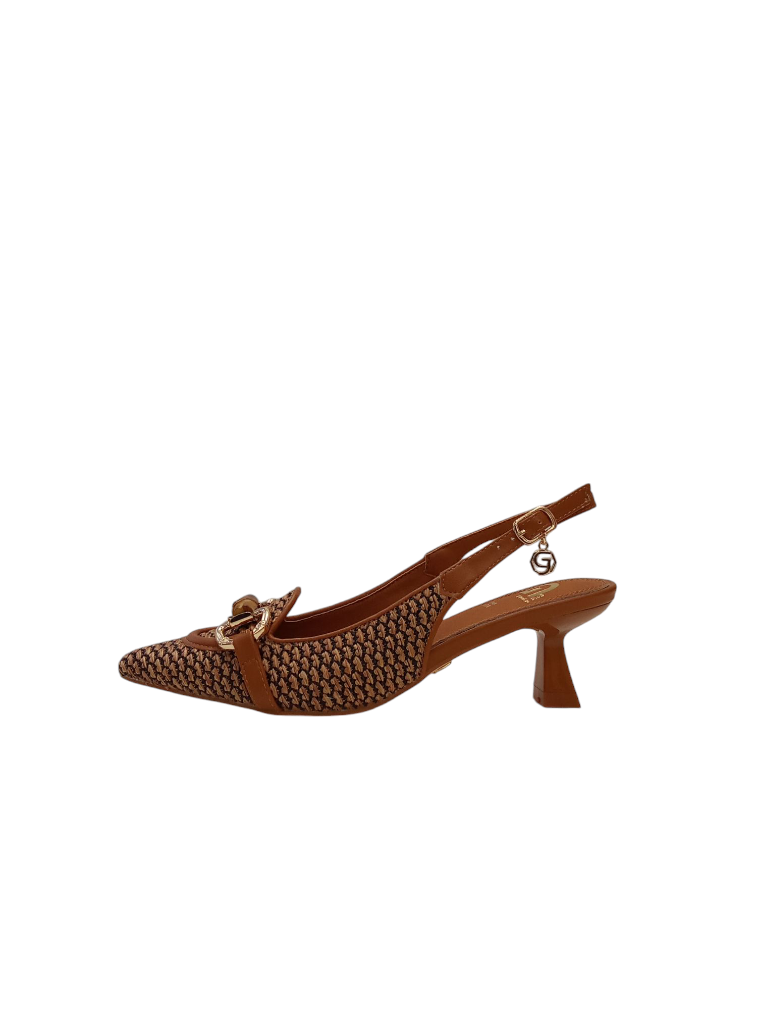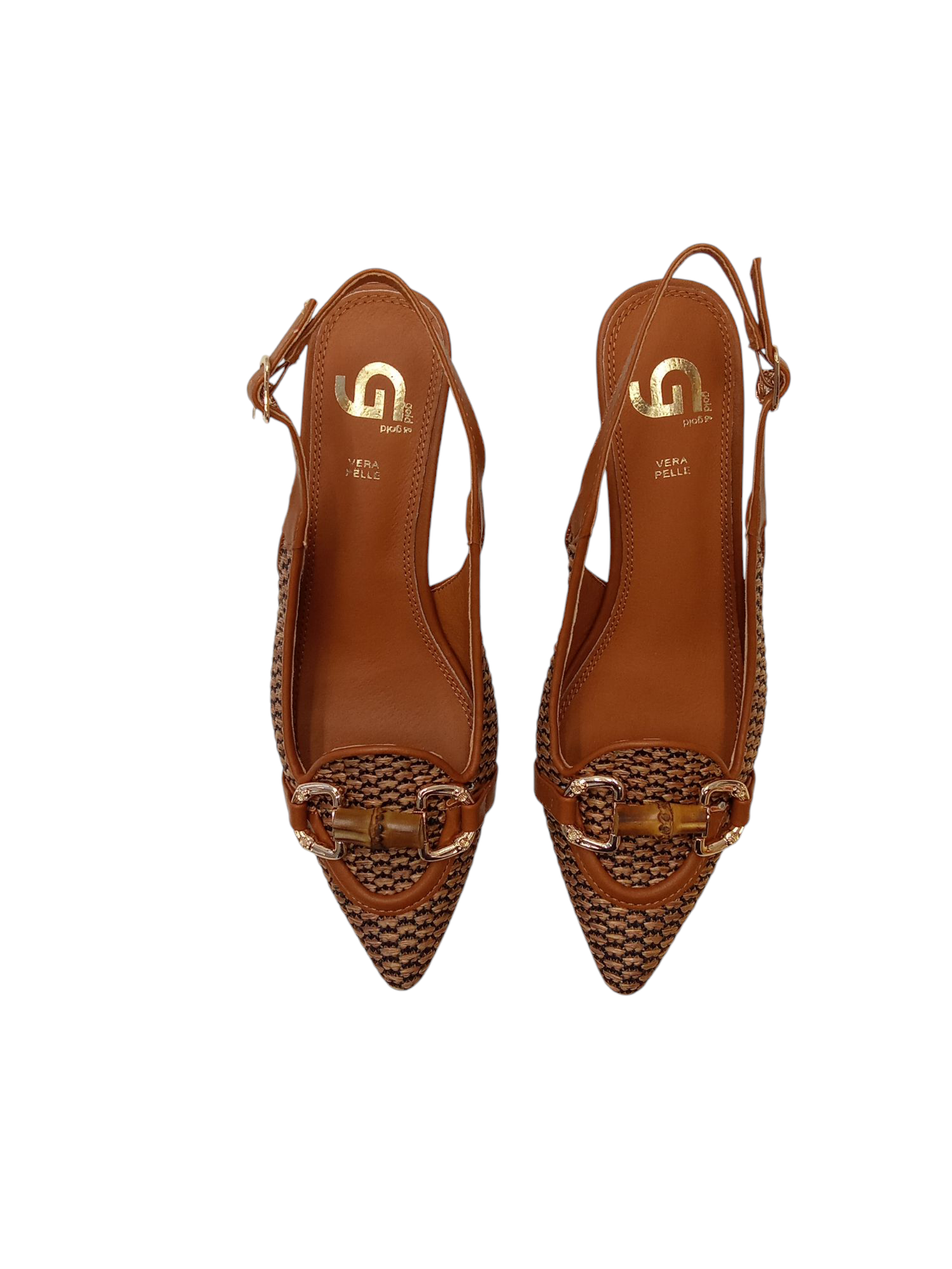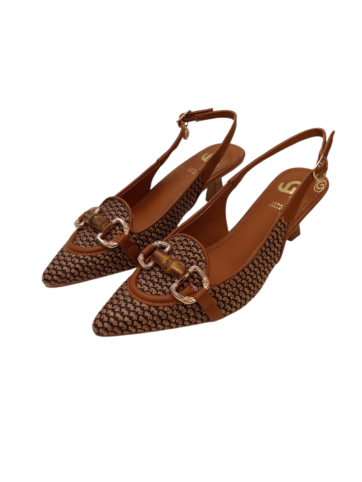 CHANEL GOLD & GOLD, APERTA SUL TALLONE, CON CINTURINO REGOLABILE, TESSUTO INTRECCIATO CON ACCESSORIO.