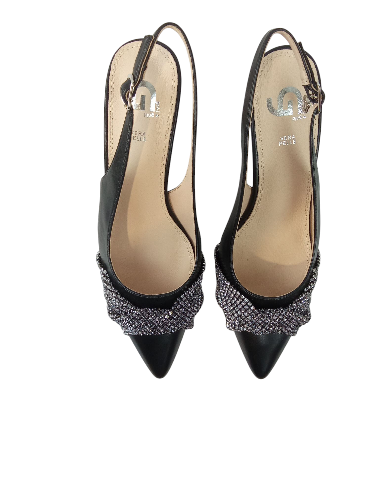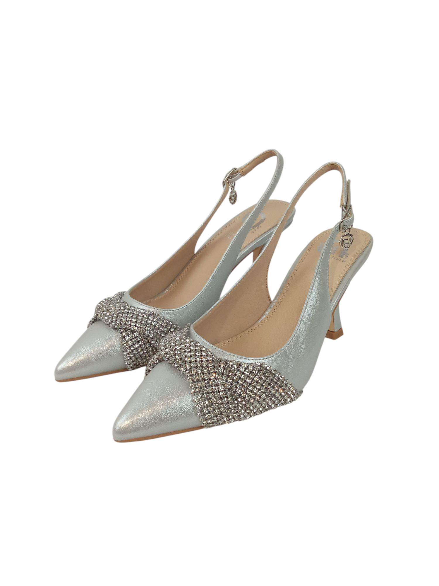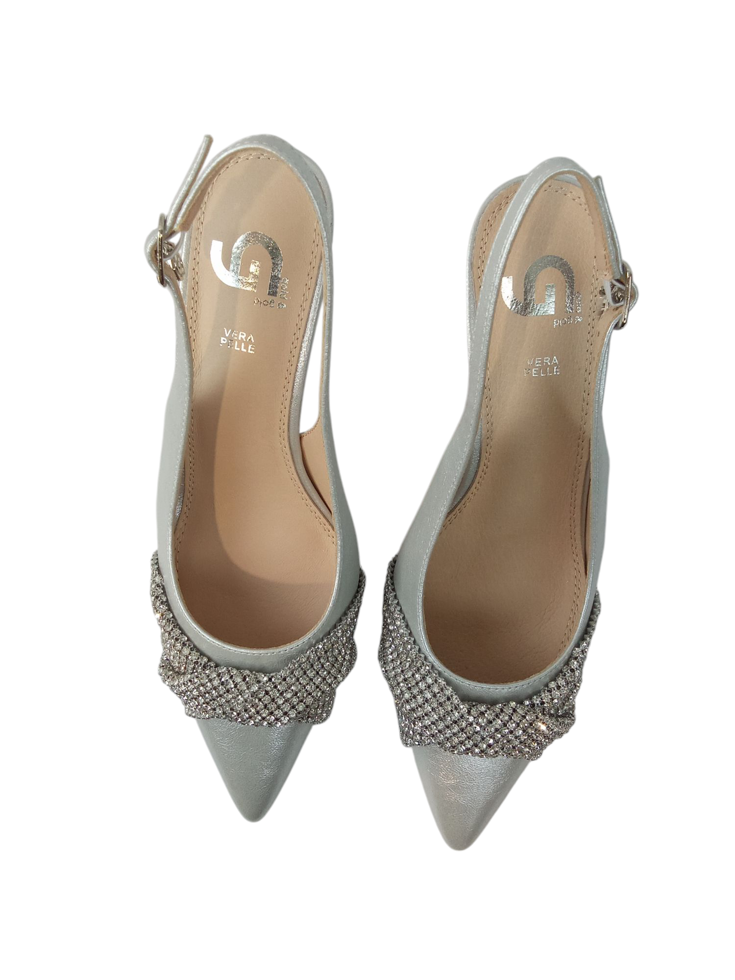 DECOLLETE' GOLD & GOLD, CON TALLONE SCOPERTO IN UNA STRUTTURA A PUNTA IN ECOPELLE, SOLETTA CON IMBOTTITURA IN VERA PELLE, ACCESSORIO INTRECCIATO.