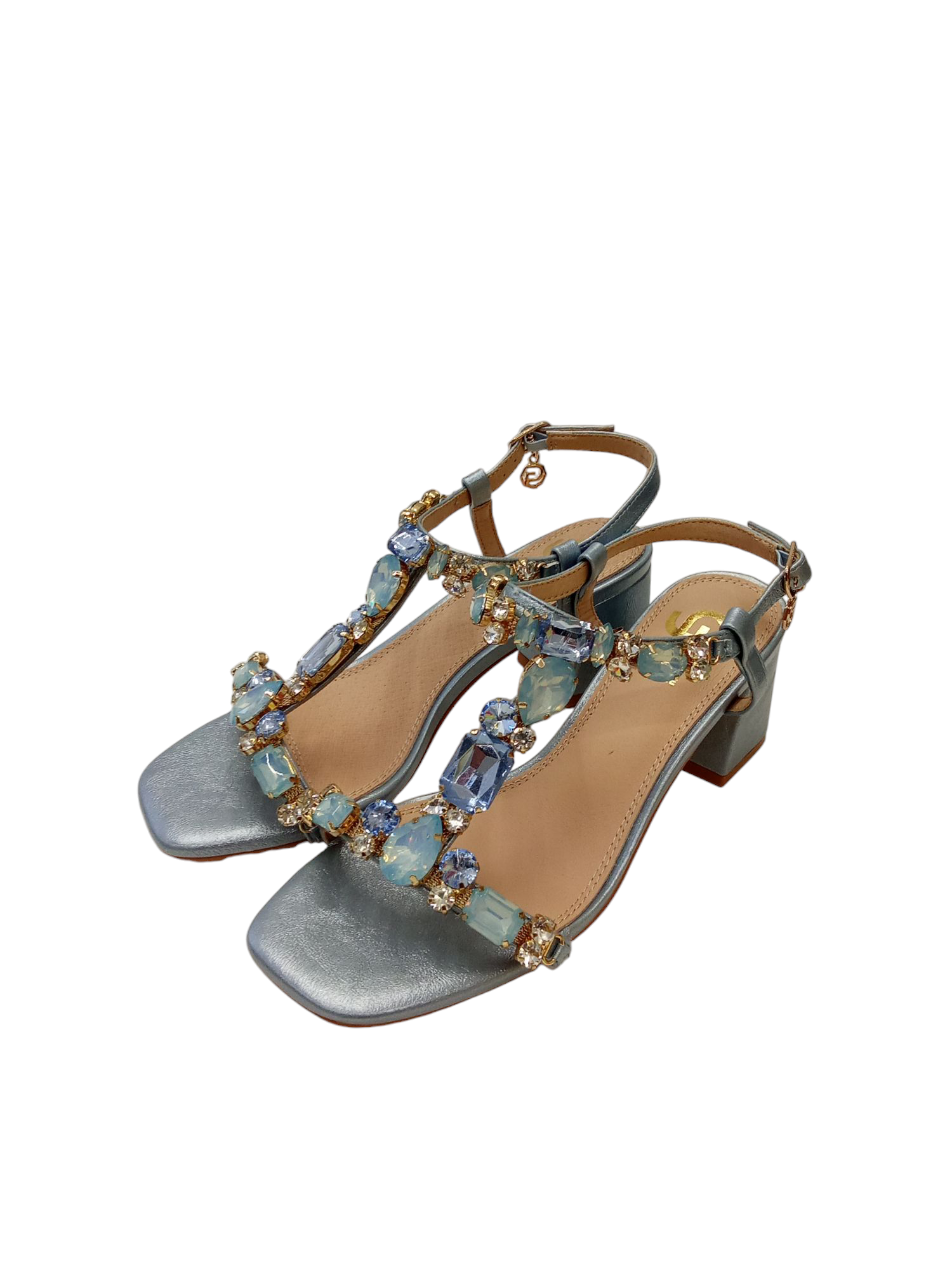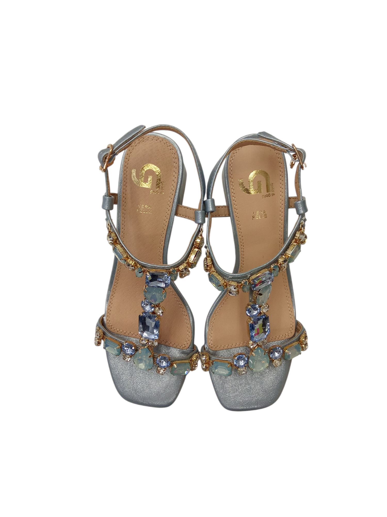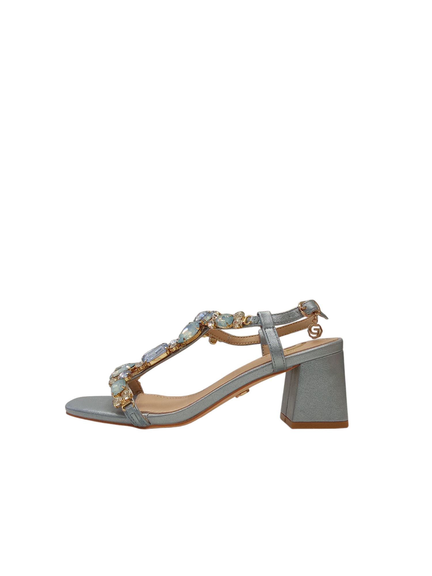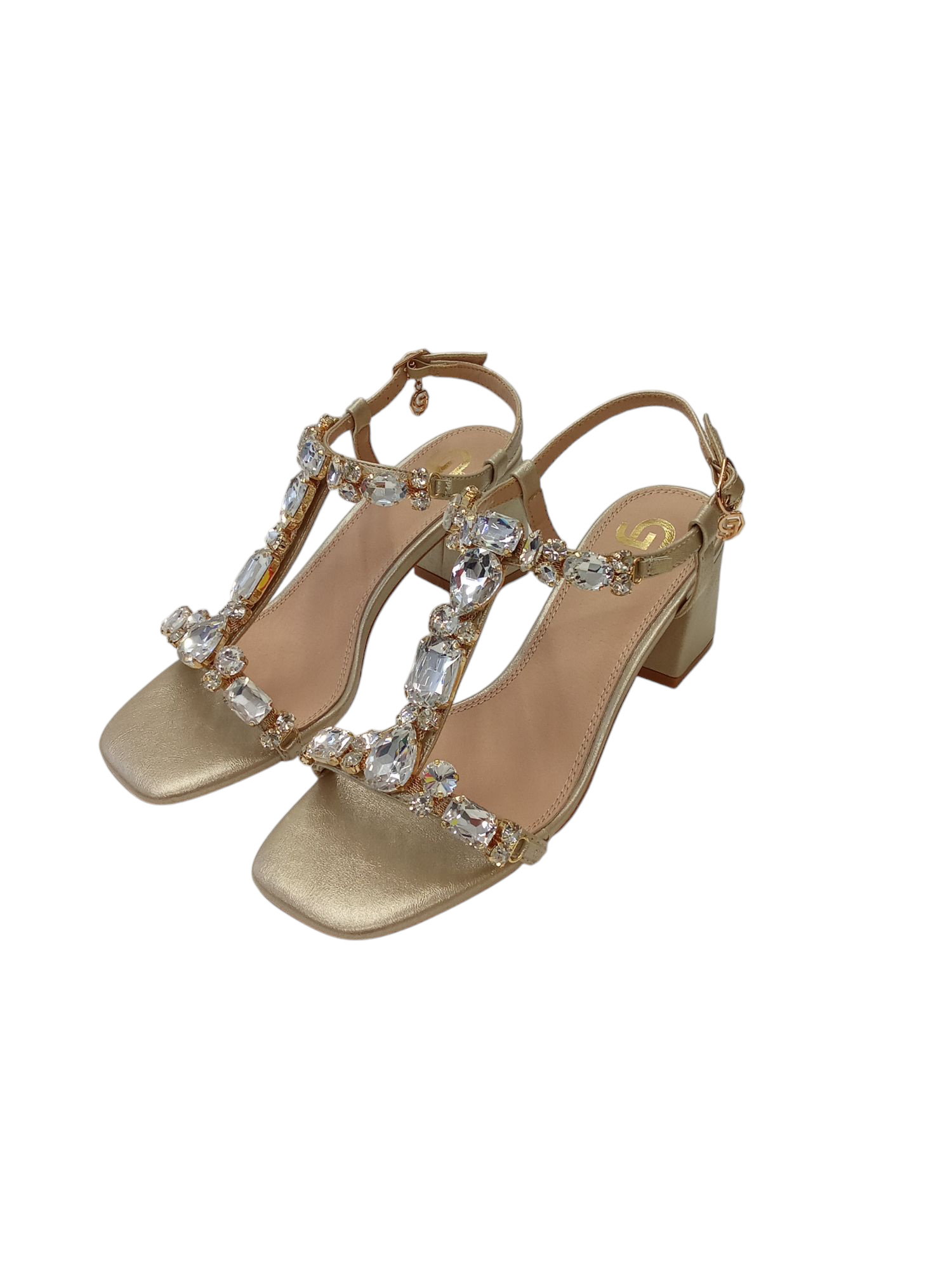 SANDALO GOLD & GOLD, IN ECOPELLE, CHIUSURA CON CINTURINO, STRASS IN APPLICAZIONE, SOTTOPIEDE IN PELLE, TACCO LARGO E PUNTA QUADRATA.