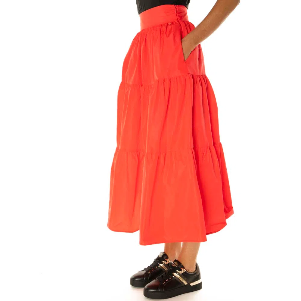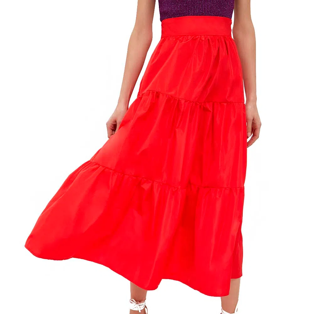 Gonna lunga a vita alta in taffetà. Chiusura con zip laterale e gancetto. Balze sul fondo. Tasche laterali. Sfoderata.