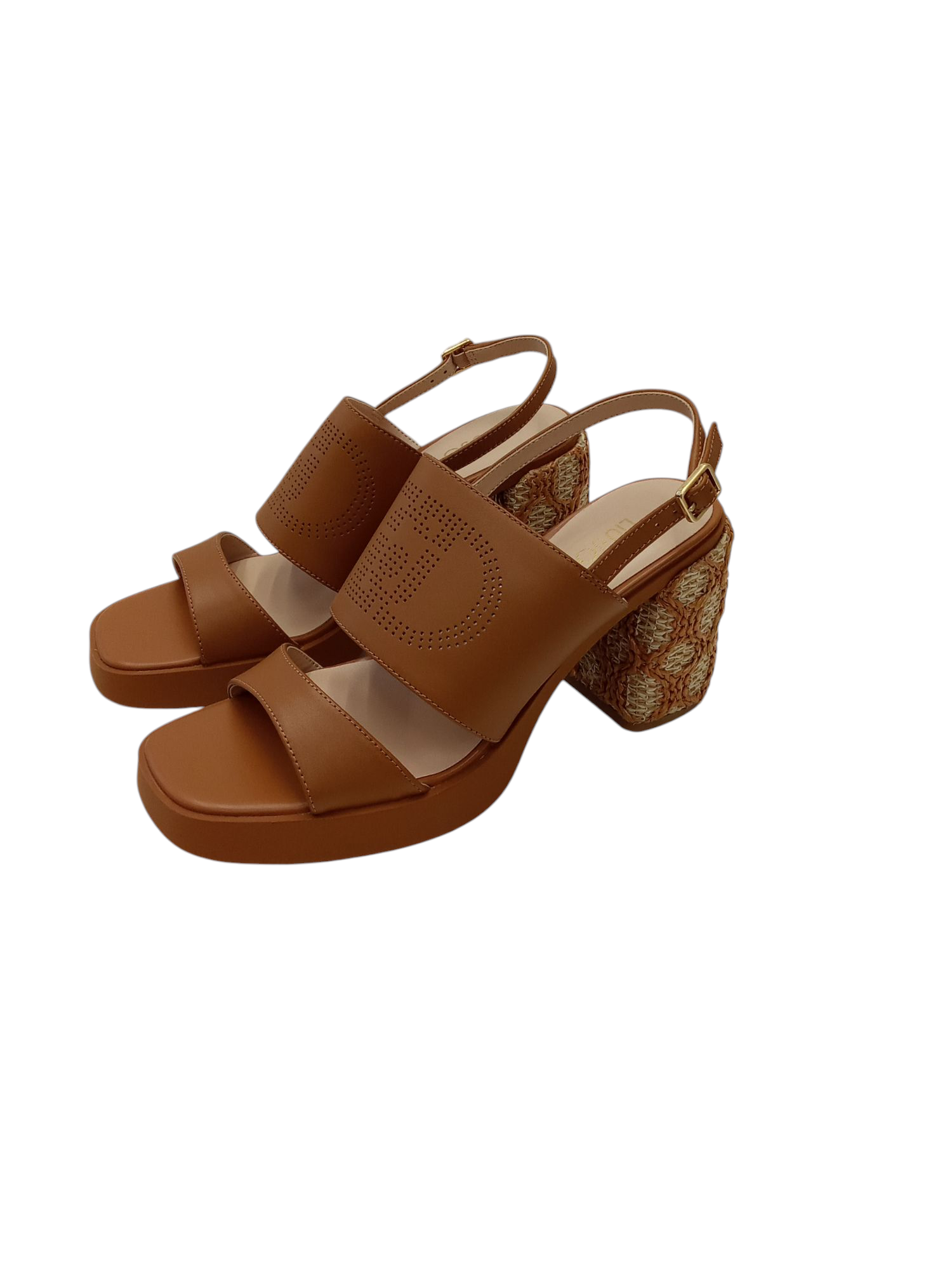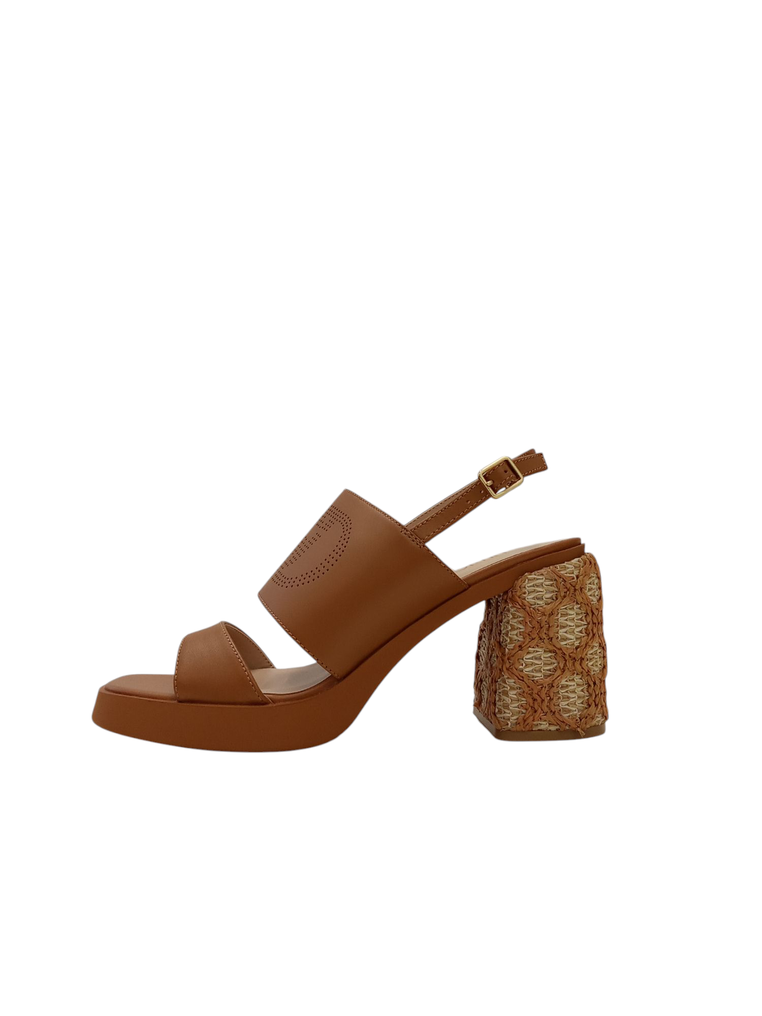 SANDALO LIU JO, CON FASCETTE IN PELLE E MAXI LOGO, CHIUSURA CON CINTURINO REGOLABILE ALLA CAVIGLIA, TACCO LARGO RIVESTITO IN RAFIA BICOLORE, ALTEZZA 8,5 Cm.