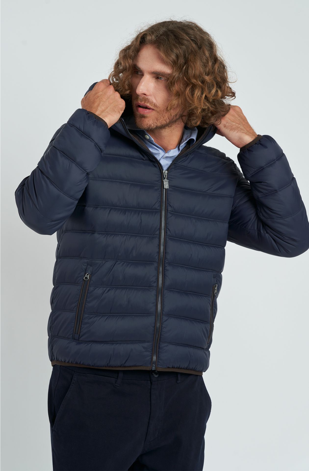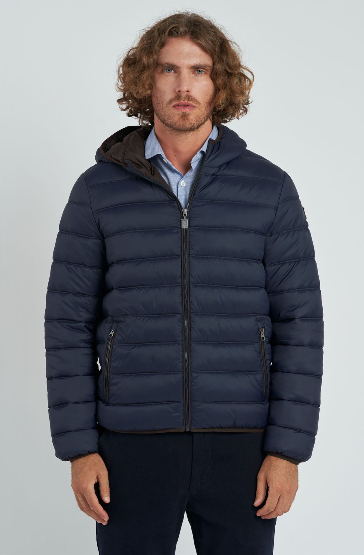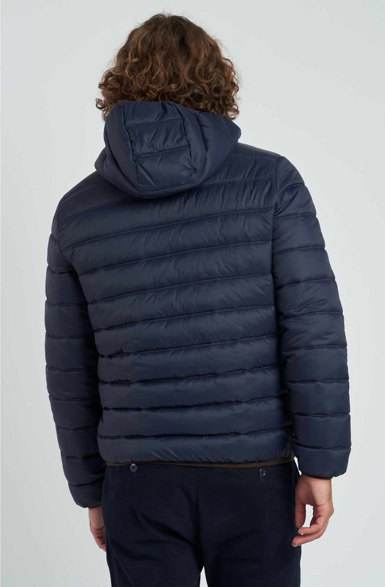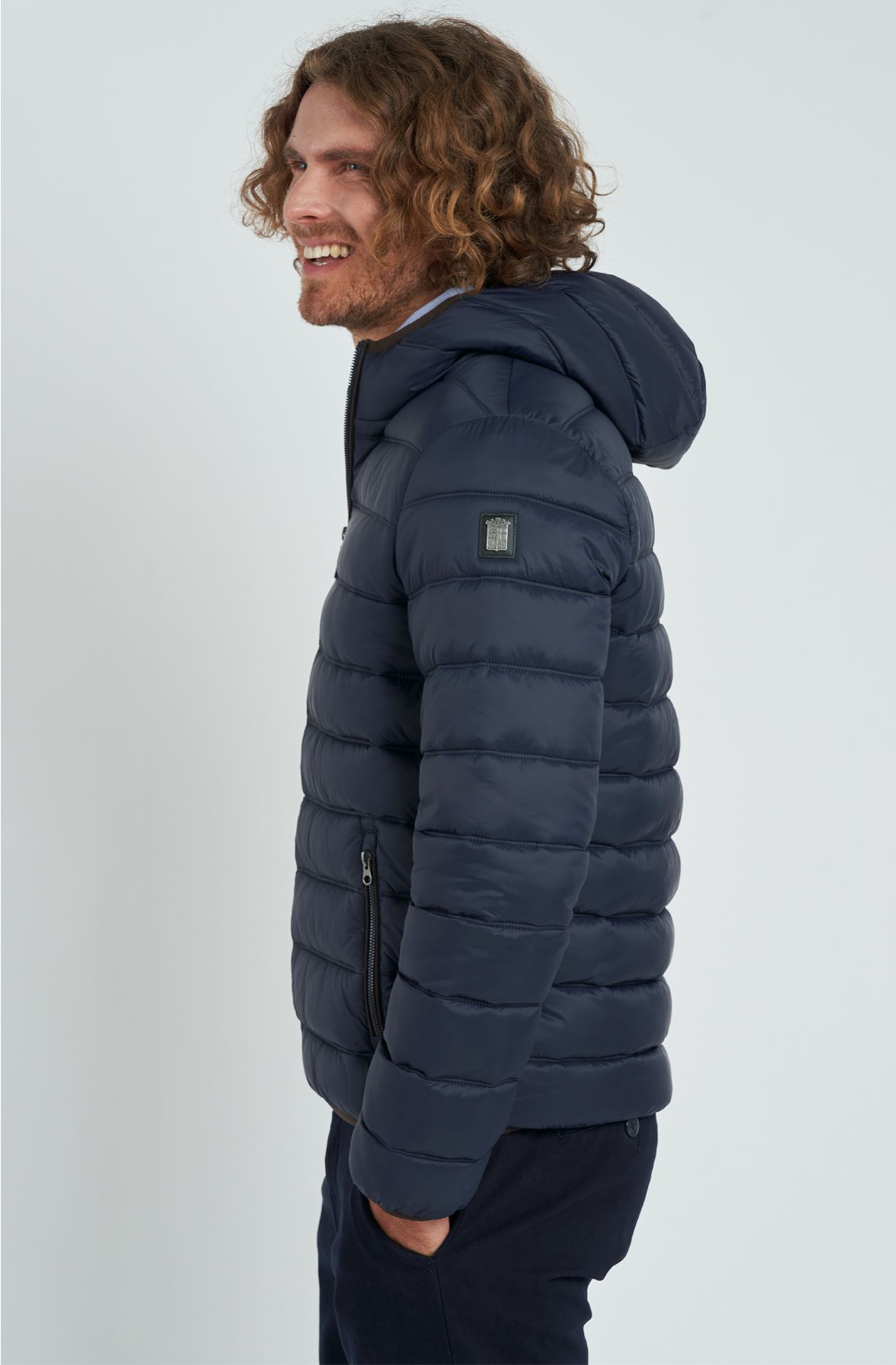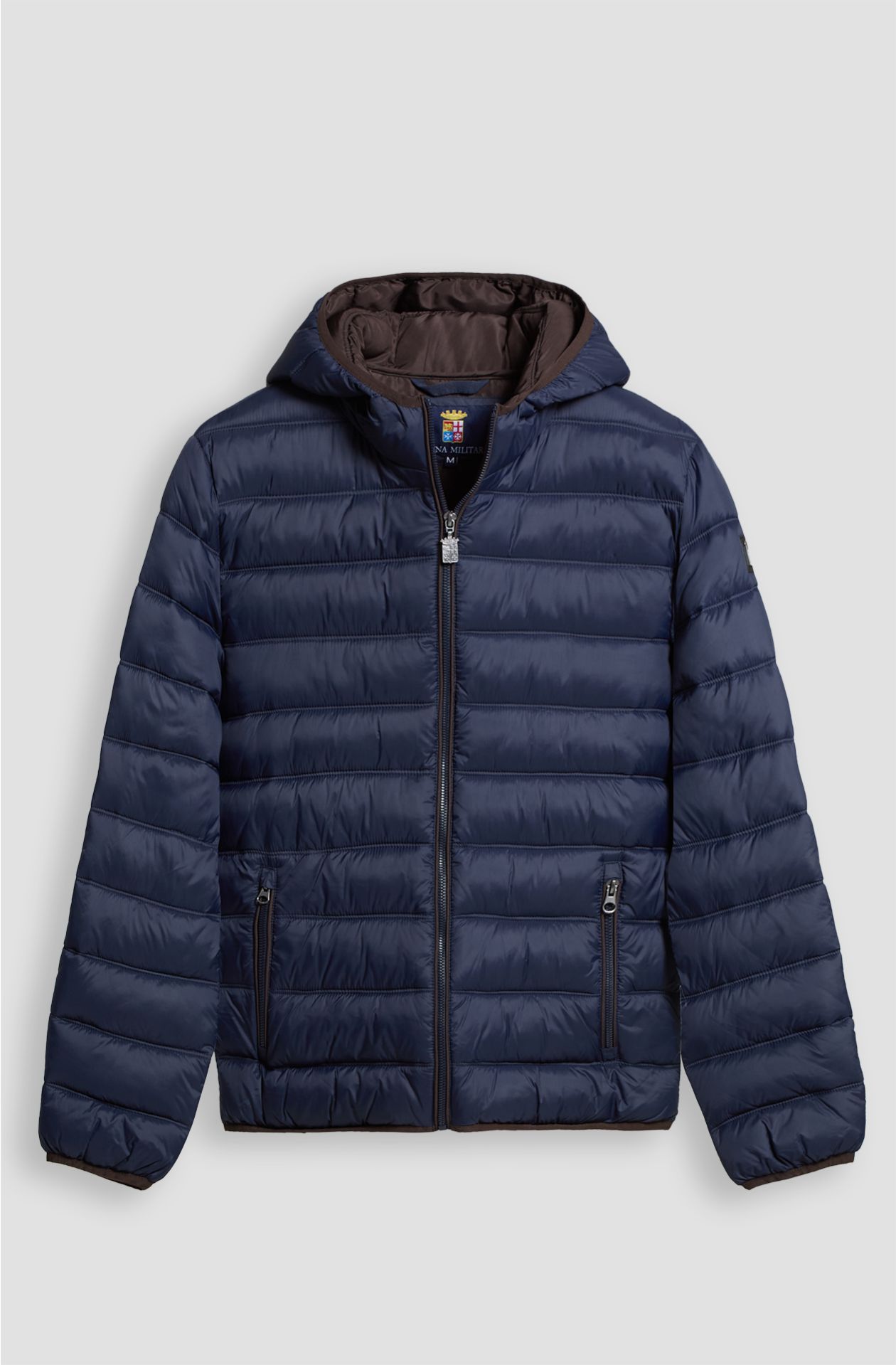 PIUMINO MARINA MILITARE, IN NYLON CON CAPPUCCIO FISSO, TRAPUNTATO A LINEE ORIZZONTALI, IMBOTTITURA IN OVATTA, APERTURA E TASCHE CON ZIP, CURSORE IN METALLO PERSONALIZZATO, INTERNO CON DUE TASCHE A TOPPA APERTE, BORDI DEFINITI CON ELASTICO NERO, PATCH LOGO IN METALLO SU PATCH DI PELLE SULLA MANICA SINISTRA.