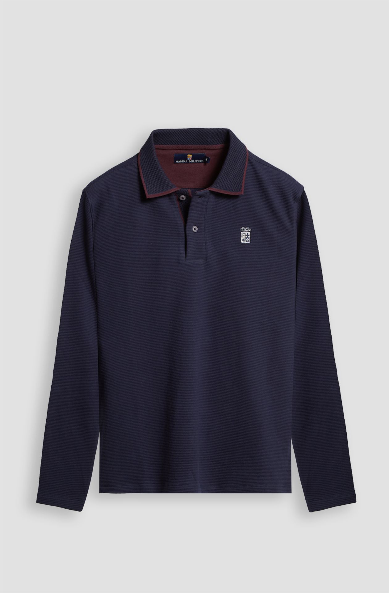 POLO MARINA MILITARE, CON APERTURA A DUE BOTTONI, COLLETTO A NIDO D'APE CON BORDO IN CONTRASTO COLORE, SPACCHETTI RINFORZATI IN GROS GRAIN, POLSINI NON RIPRESI, LAVORAZIONE A RIGHE ORIZZONTALI, JACK DELLA MARINA MILITARE IN BICOLORE RICAMATO SUL CUORE.