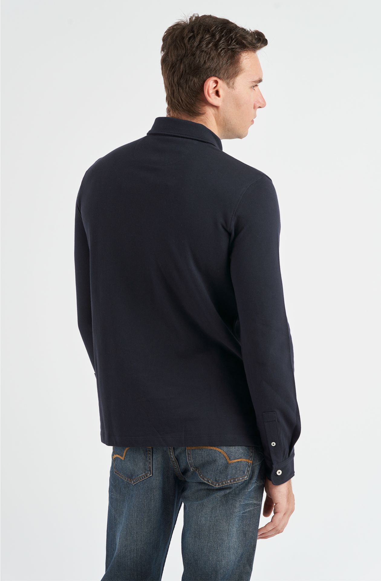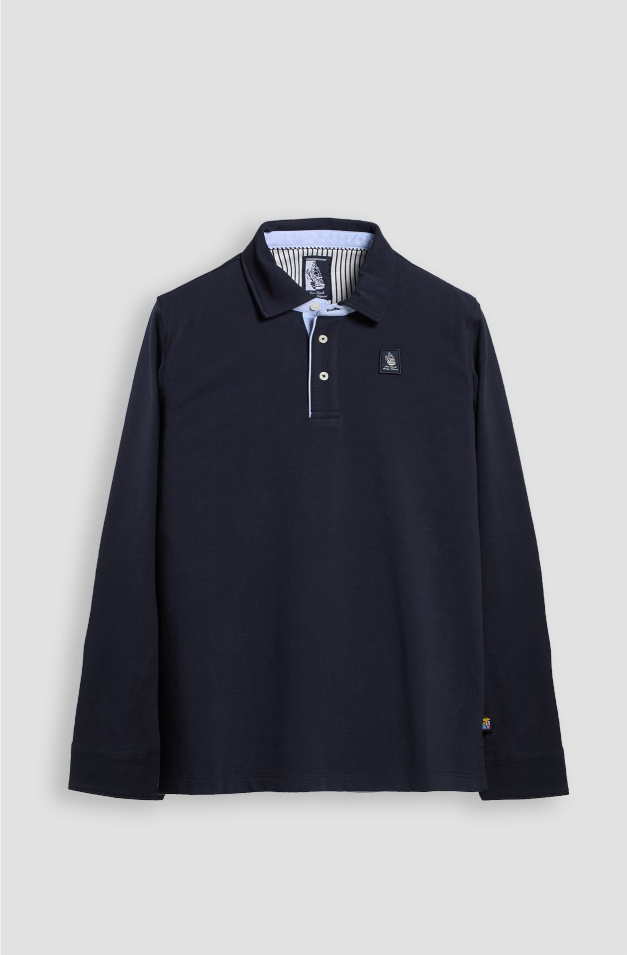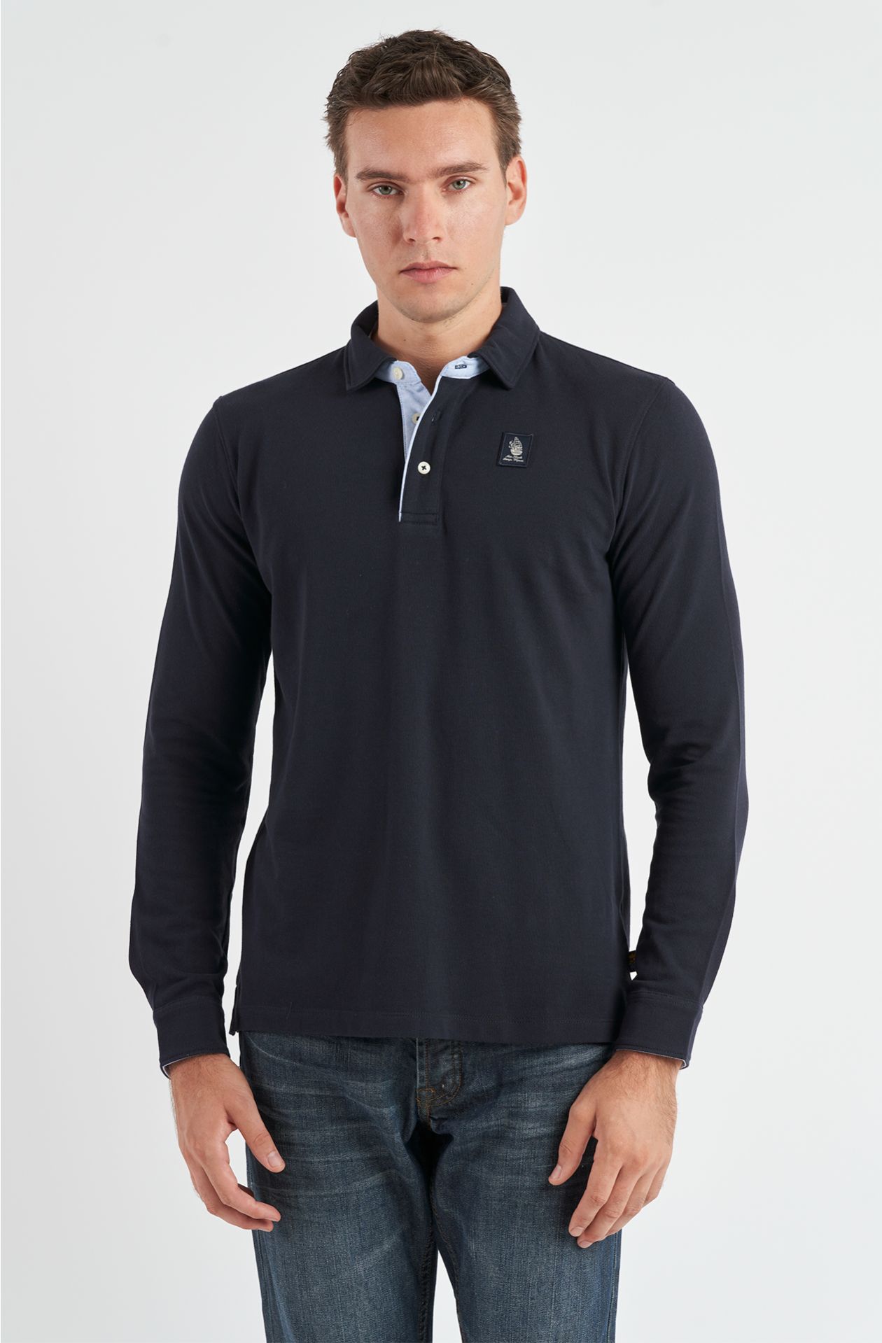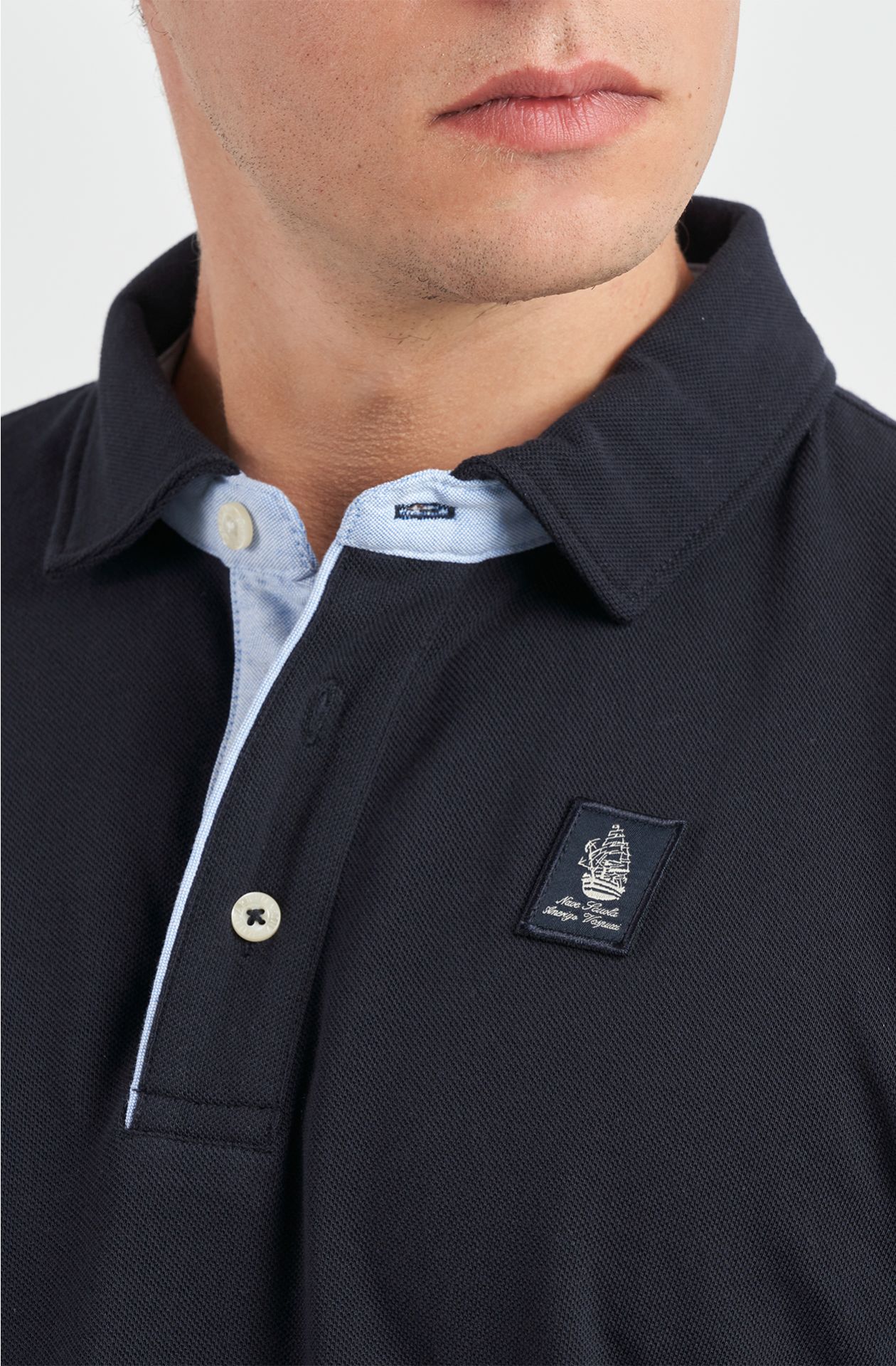 POLO MARINA MILITARE, A TRE BOTTONI, MEZZA LUNA INTERNA IN COTONE RIGATO CON PARA SUDORE IN COTONE, POLSINI APERTI A CAMICIA, SPACCHI LATERALI RINFORZATI, PATCH CON IL RICAMO DEL PRESTIGIOSO VELIERO CUCITO SUL CUORE.